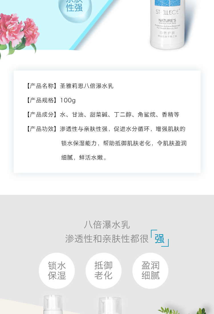 1、质地清爽水滑,轻轻拍打即刻化为大量清莹水份,可充分体验瀑水感,,顷刻间每一层肌肤******水盈饱满,活力绽放;