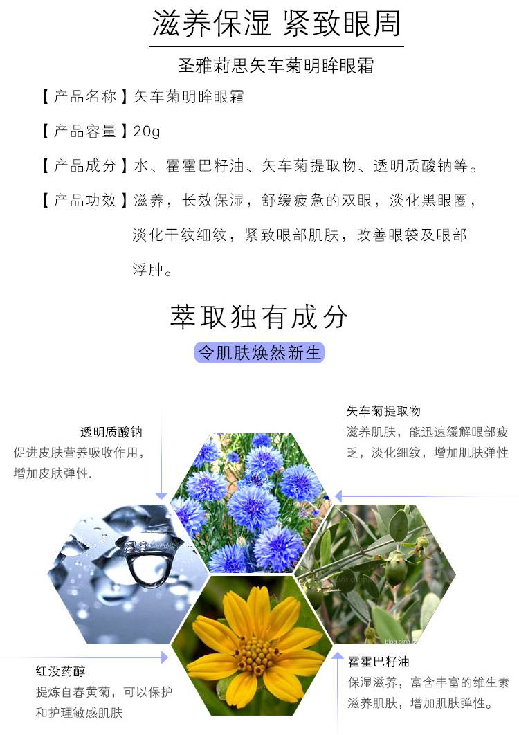 ST-ELLECE圣雅莉思 熊莓洁颜蜜60g眼膜眼霜二合一、舒缓疲劳、紧致眼肌、滋润保湿 产品功效:这是一款可以当眼膜使用的眼霜,有效滋养,长效保湿,赋予眼周肌肤丰沛的滋润度;舒缓疲惫的双眼,有效改善因熬夜、睡眠不足、眼睛疲劳等所造成的眼周暗沉干涩,淡化黑眼圈;提亮眼周肤色,淡化干纹细纹,紧致眼部肌肤,改善眼袋及眼部浮肿。 产品用法;取适量点涂于眼周,轻轻打圈按摩至吸收。当滋养眼膜使用时,厚厚敷于眼周停留15-20分钟后,清水洗净即可。
