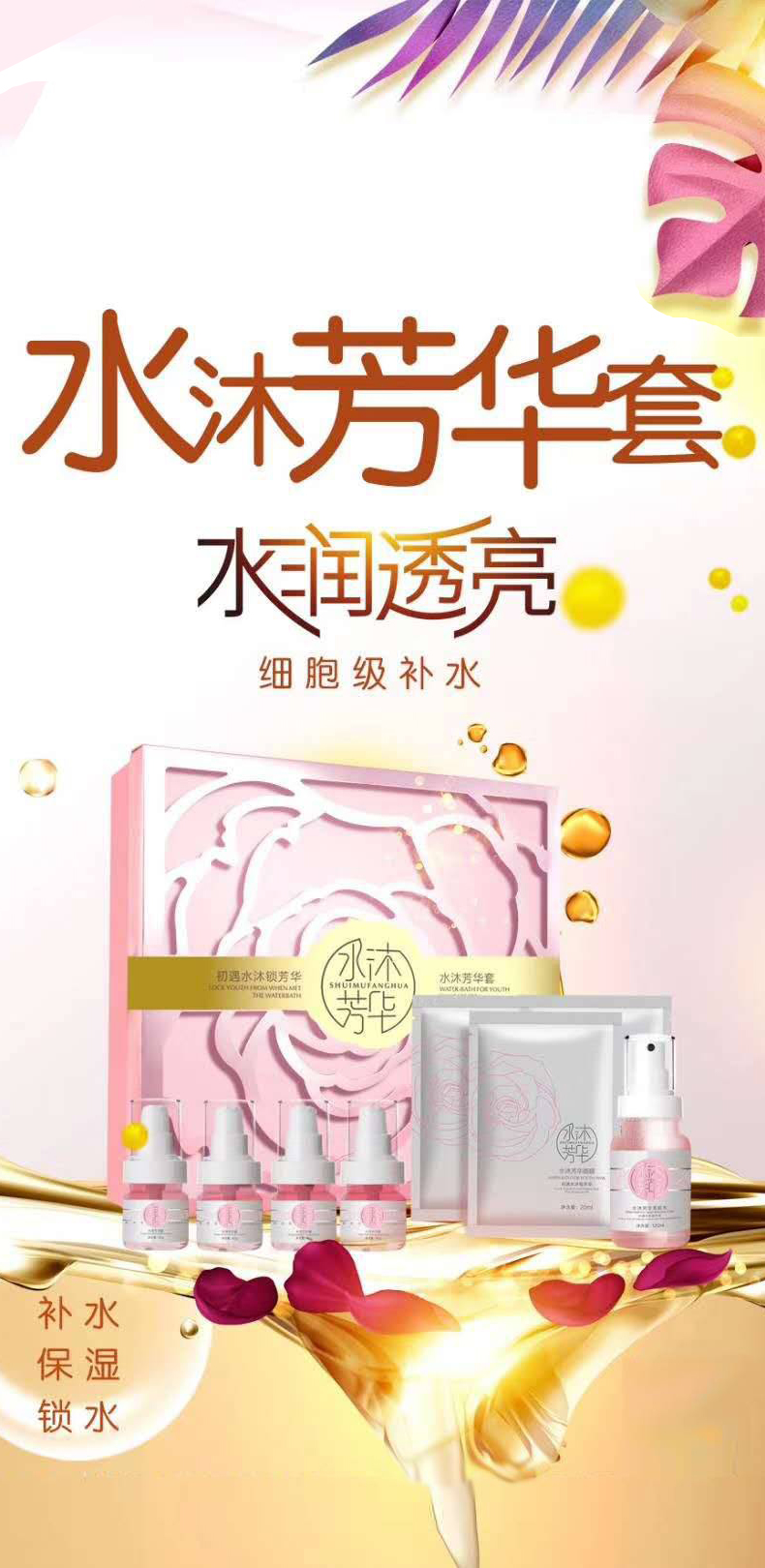 ST-ELLECE圣雅莉思 水凝精华喷雾组合 清透、细致、光滑、盈泽 套盒组成:1.水木芳华洁面乳30g2.水木芳华美肌水120ml3.水木芳华面膜20ml/片*12片4.水木芳华精华30ml5.水木芳华霜45g/瓶*6瓶