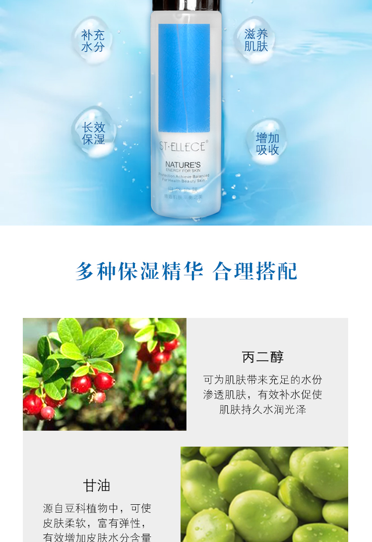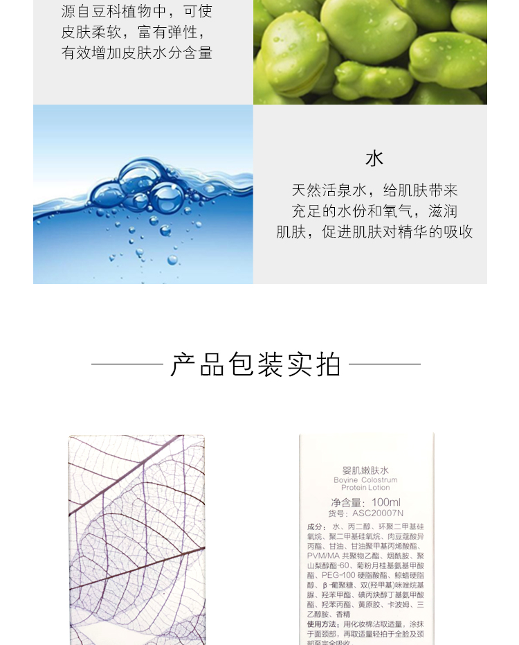 产品功效:富含丰富牛初乳蛋白等多种营养成份,同时渗透力,保湿柔肤、二次清洁,有效平衡肌肤水油分泌,发挥活肤、嫩肤、保湿的三大效能。